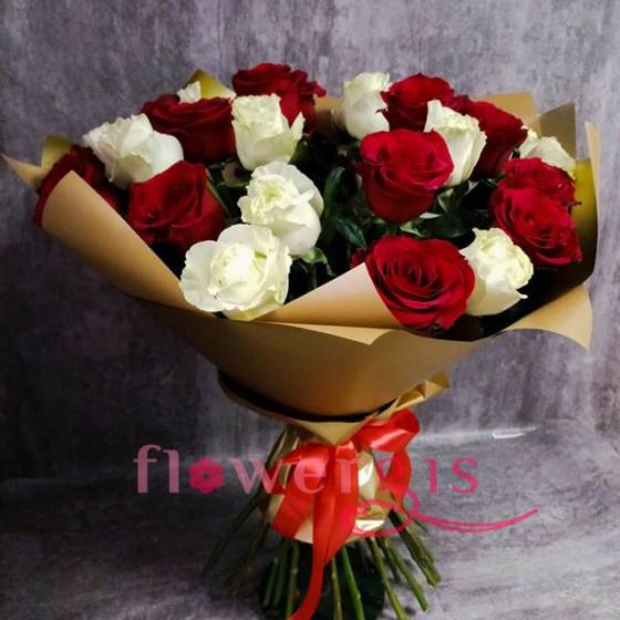 Всеми любимое сочетание белого и красного цвета в подчеркивающей золотистой упаковке, будоражит воображение и заставляет влюбиться в этот букет с первого раза. Не проходите мимо него, потому что он не пройдет мимо вас.